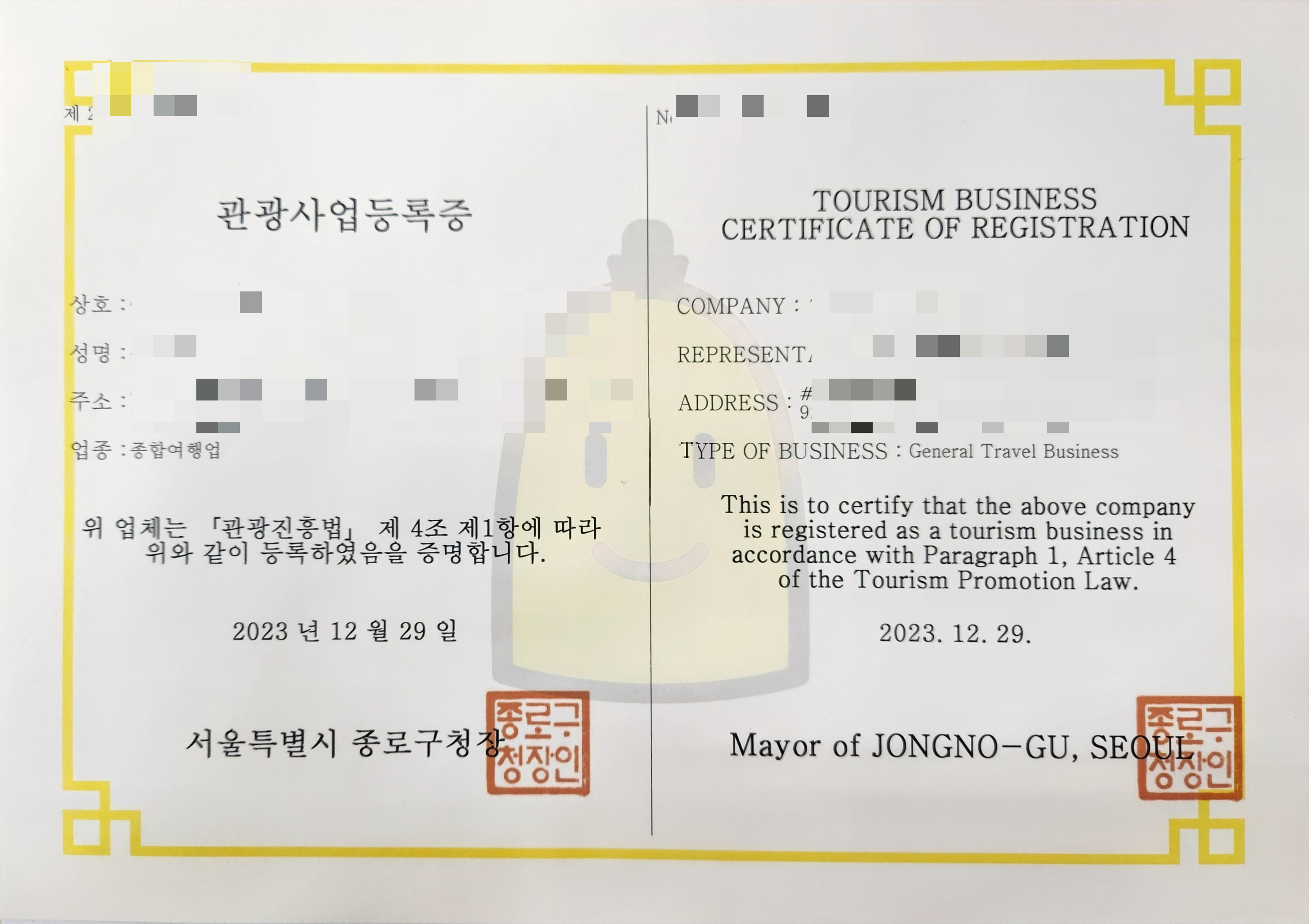 2023년 마지막 금요일에 발급된 관광사업등록증입니다.